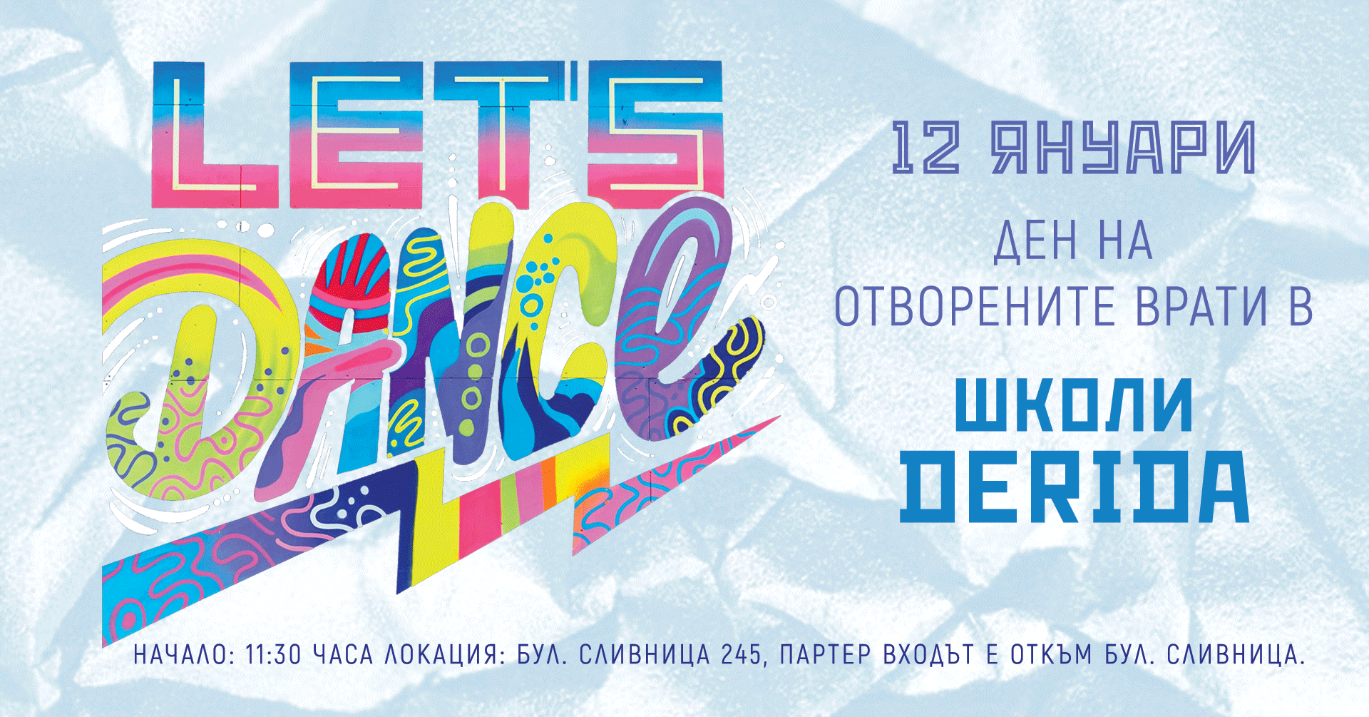 Събота е ден за танцуваме и в това студено време мечтаем за нещо, което да раздвижи кръвта ни. Този уикенд Танцовална школа Derida ще се погрижи за това като отваря вратите си за всеки, който иска да се докосне до танците. Ще можете безплатно да посети часове по Народни, Ирландски, Модерни танци и други стилове. Ще изгориш калории, ще сгрееш душата и тялото си пък кой знае, може би ще откриеш своя нов любим танцовален стил.