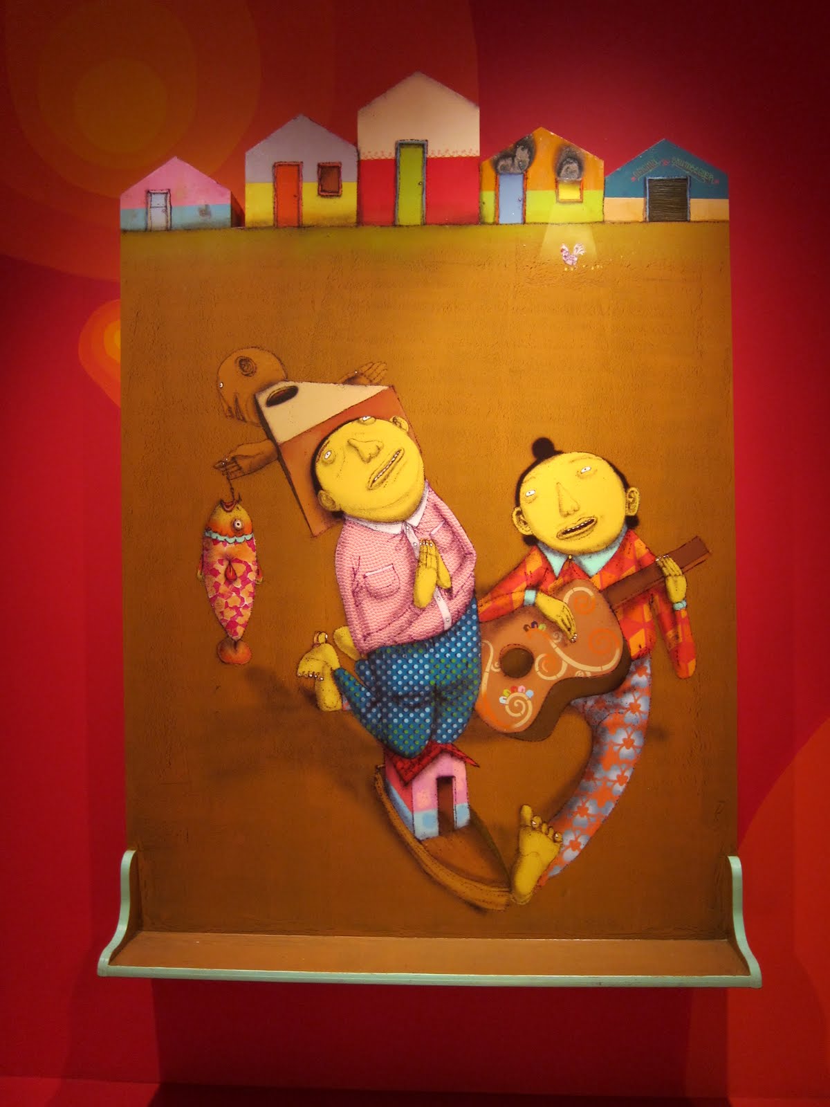 Добри рисунки на Os Cemeos забелязахме преди месец на първата им самостоятелна изложба в PRISM, Лос Анджелис. Нарекли я Miss You. Галерията напомняше лабиринт, през който ви превеждат иконичните герои на близнаците, присъстващи в почти всички изложени работи. Сред най-интересните за нас рисунки се оказа Do Outro Lada Da Lua (Другата страна на Луната), завършена през февруари тази година – линии, контрастиращи цветове и перспектива, която ви оставя с впечатление, че жълтият герой е заклещен, лишен от възможността за свободно падане. Двамата винаги намират начин да замесят познати елементи, било то поп културни, политически или други символи, да ги претопят и влеят в стила си. В тази изложба детайли навяваха на Тим Бъртъновия Beetlejuice и на стила на Hayao Muyazaki. Сред новите работи имаше скулптури и дори ръчно тъкани гоблени, за които е помогнала майката на близнаците. Текстилът е така пришит към галерийното пространство, сякаш с цел да отвори дупка, своеобразен вход от нашия към техния аленочервен алегоричен свят. Лесно е да се изгубиш след подобни оптическите илюзии.