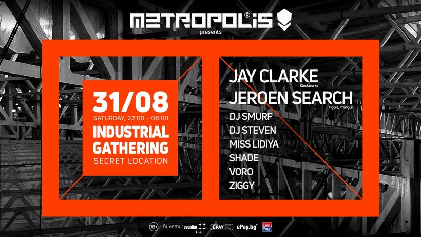 Метрополис ни събират за Industrial Gathering. Локацията е секретна, но лайн ъп-ът не – зад пулта ще са Jay Clarke, Klockworks, Jeroen Search и много други. Не спирай да следиш събитието във ФБ, защото след първи август ще можеш да сглобиш пъзела, който да те отведе до партито.