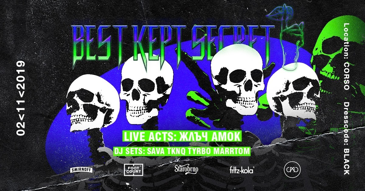 Най-добрият начин да запазиш скрита тайната е да се преструваш, че не съществува. Този уикенд Best Kept Secret в града те очаква отново в непозната досега локация, за едно разтърсващо парти. Дрескодът отново е black, а специално за изданието те очаква лайв изпълнение на „Жлъч“. Какво още – следи в страницата на събитието във facebook.