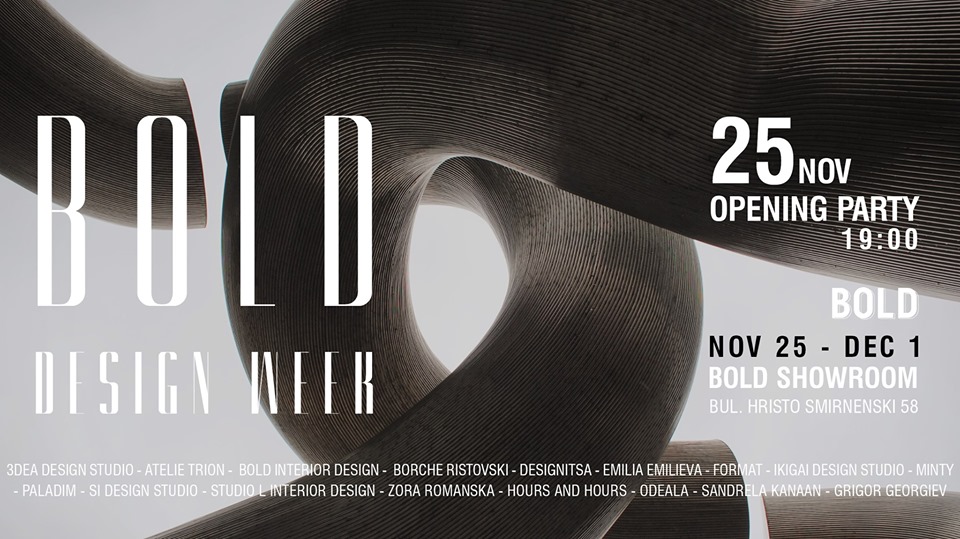 От този понеделник, та чак до началото на декември с нетърпение ще следим Bold Design Week. На територията на шоурума ще бъдат представени различни области от съвременния дизайн под формата на изложения и поредица от дискусии, работилници и лекции. Целта на BOLD DESIGN WEEK (BDW) е да даде шанс на местни и международни дизайнери да изложат своите произведения и услуги на българския пазар. За подробна информация и списък с яките изложители погледни на страницата на събитието във Фейсбук.