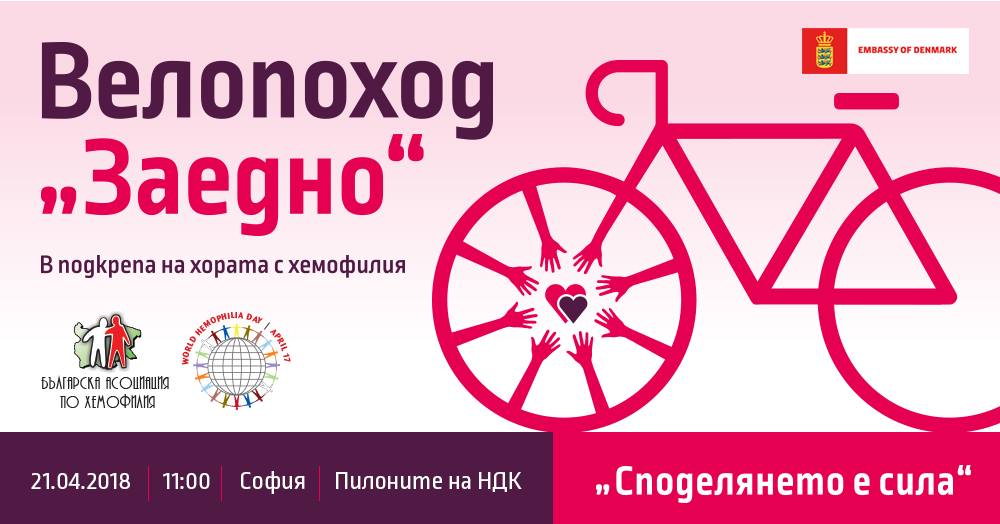 Включи се в градският велопоход „ЗАЕДНО“. Организиран от Българската асоциация по хемофилия, чрез него ще се информираш за характера на заболяването. Чудесен повод да се раздвижим и да подкрепим подобряването на лечението и качеството на живот на всички с тази болест. Пловдив, Варна и Бургас също се присъединяват.