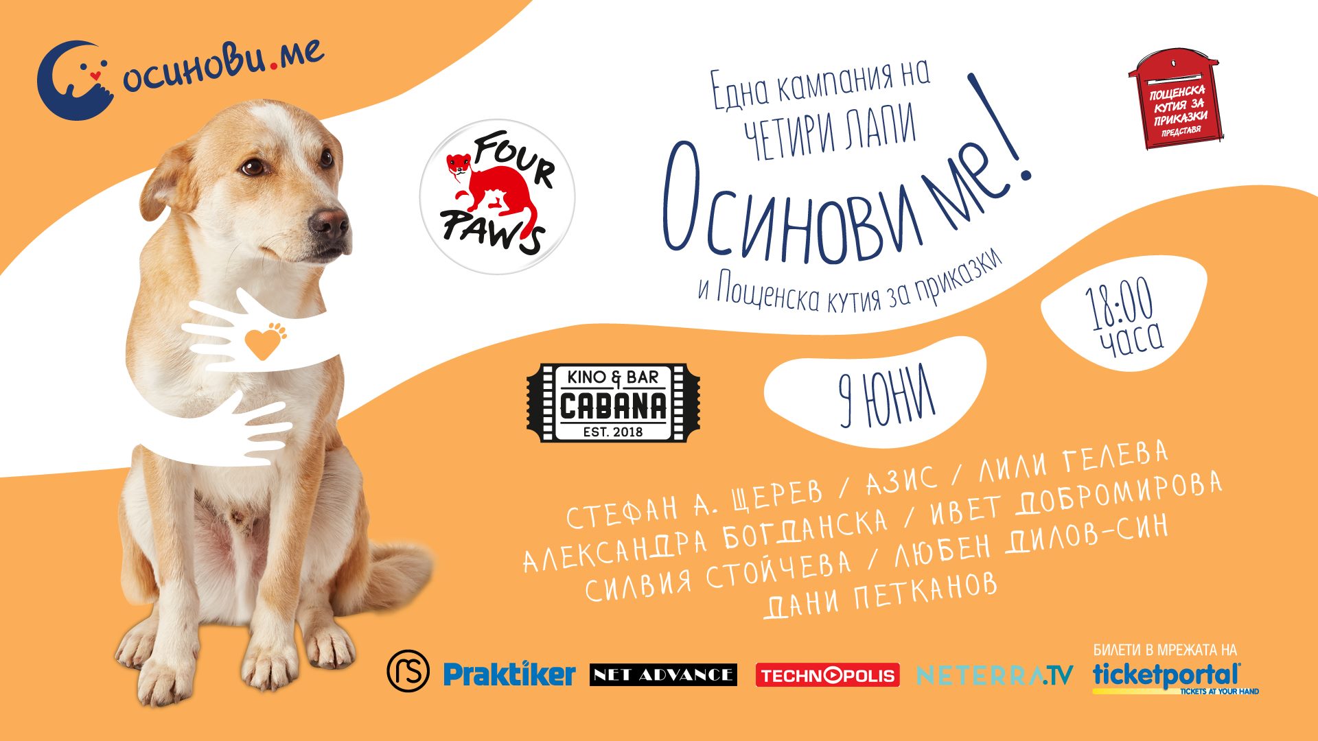 Пощенска кутия те кани на четене за животните и хората в партньорство с Организация за защита на животните "Четири лапи"! Заповядай с четириногите членове на семейството си в Kino Cabana. Вдъхновяващи, трогателни, истински и измислени истории за хора и животни ще четат Стефан А. Щерев, Азис, Лили Гелева, Александра Богданска, Ивет Добромирова, Силвия Стойчева, Любен Дилов-син, Дани Петканов, заедно с осиновени любимци. На място ще имаш възможност и да се запознаеш с някои от героите на кампанията, които са за осиновяване.