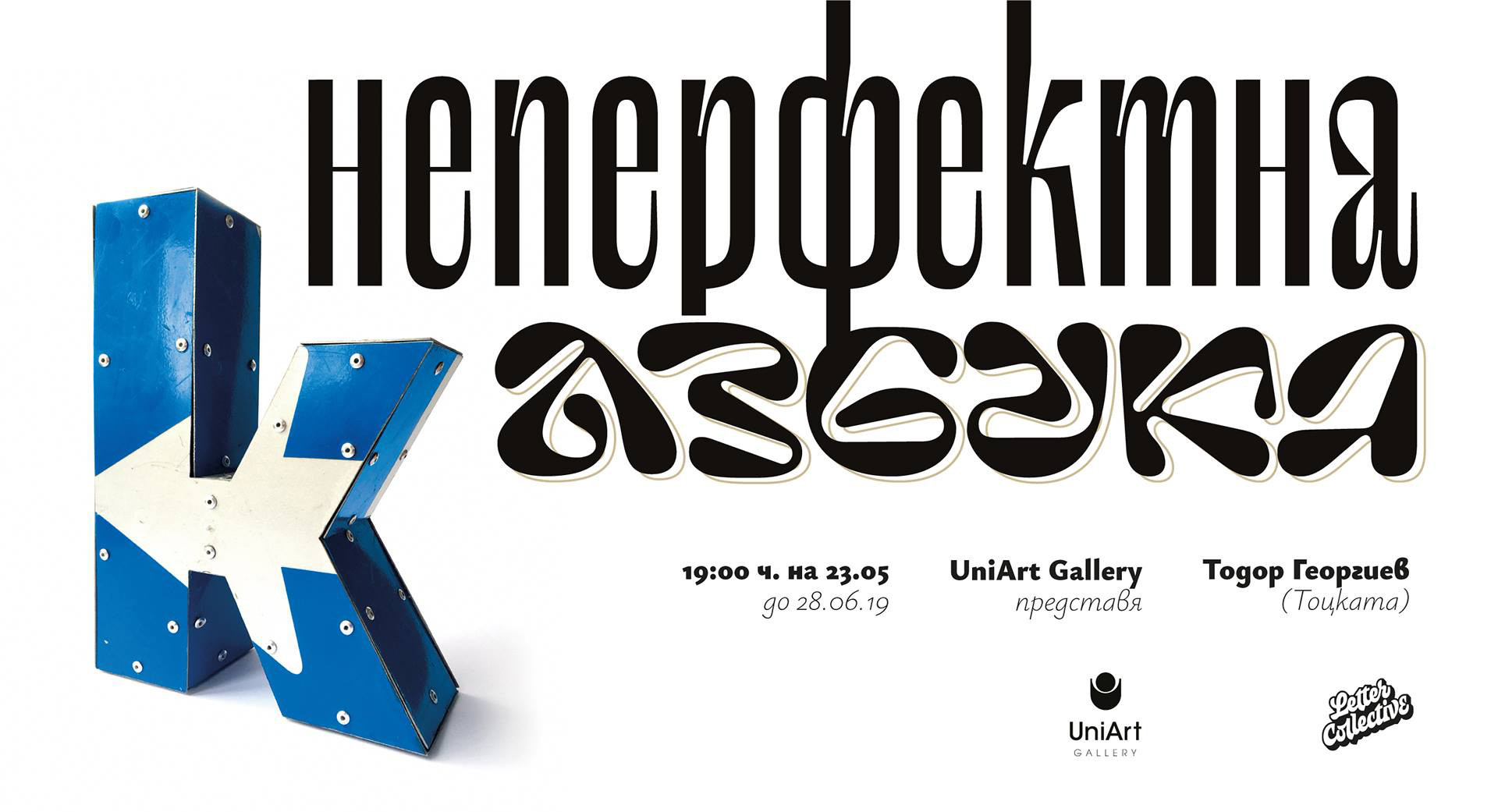 Една нестандартна изложба на Тодор Георгиев – показва един нов пластически прочит на българската форма на кирилицата, с който авторът обръща внимание върху неспособността на държавата да утвърди пред света българската азбука. Трийсетте букви са изпълнени в разнообразни техники и материали – от преоформен уличен знак до безформен звук, който отеква в пространството, ела да ги видим заедно.