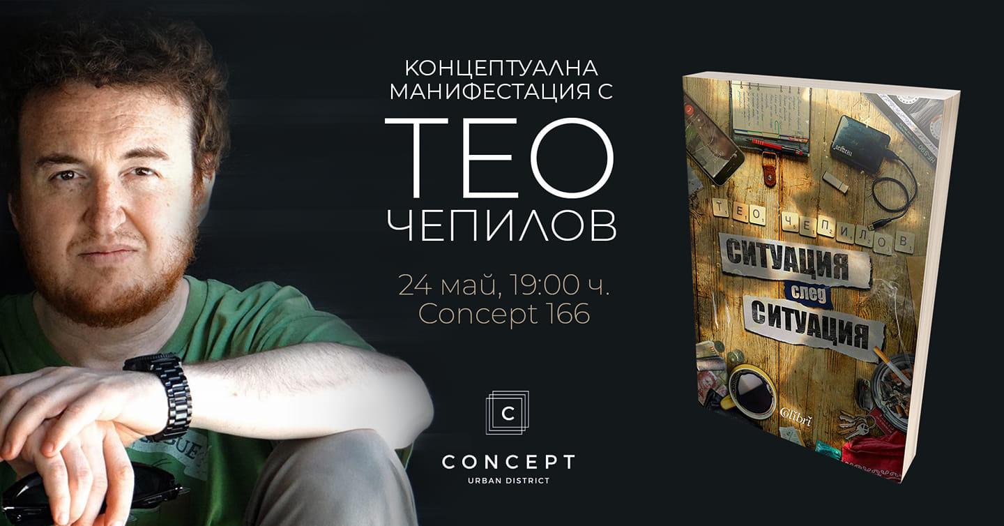 Най-най-любимият ни остър ум и чувство за хумор в едно – Тео Чепилов ни представя книга с нови разкази. Задължително намини да изпразнуваме този хубав повод на територията на Concept 166. Освен като автор в списание "Егоист" познаваме Тео и като сценарист на много от успешните български сериали, освен това ни е познат любимец и по душа и усмивка, затова, който не идва, ще пишем отсъствия.