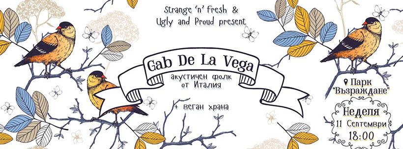 Strange and Fresh Bookings и Ugly and Proud Records представят Gab De La Vega в София. Италианският singer-songwriter номад пристига в България за бутиков, DIY концерт в парк „Възраждане”. Освен на акустичния му сет ще можем да се насладим и на вкусна веган храна, приготвена от наши приятели, а входът е само по желание. Ние все пак апелираме всички да помогнем на Габ да продължи турнето си из Европа.