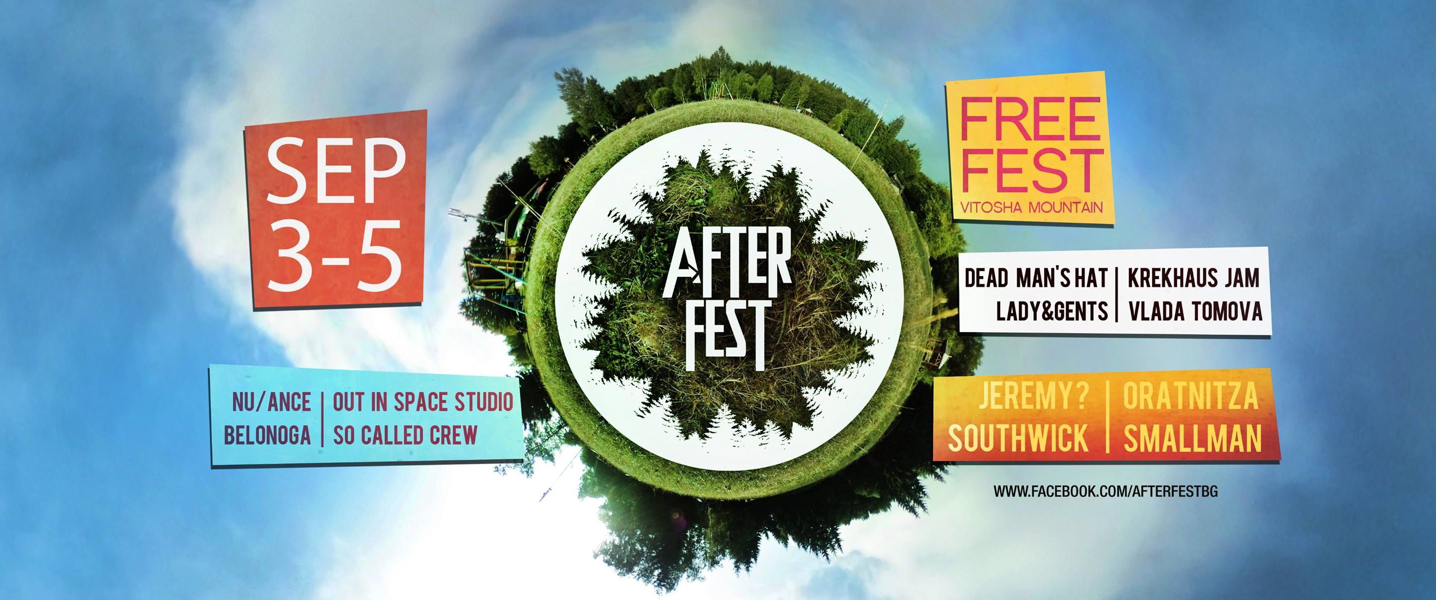За онези, които отказват да свършат лятото. И не са готови за септемврийското начало. AFTER FEST ще се случи като голямото безплатно афтър парти на летните плажни препускания. Насред Витоша ще излязат: smallman, Oratnitza, Vlada Tomova, Belonoga, SOUTHWICK, Lady&Gents, Out In Space Studio, So Called Crew, Jeremy?, KREKHAUS JAM, NU/ANCE, Dead Man's Hat. Освен в танците ще можеш да се включиш и в различни уъркшопи, интересни игри и забавления на открито, хендмейд базар, а на място ще можеш да направиш сам своя фенски афтър фест артикул, спомен за незабравимото лято.