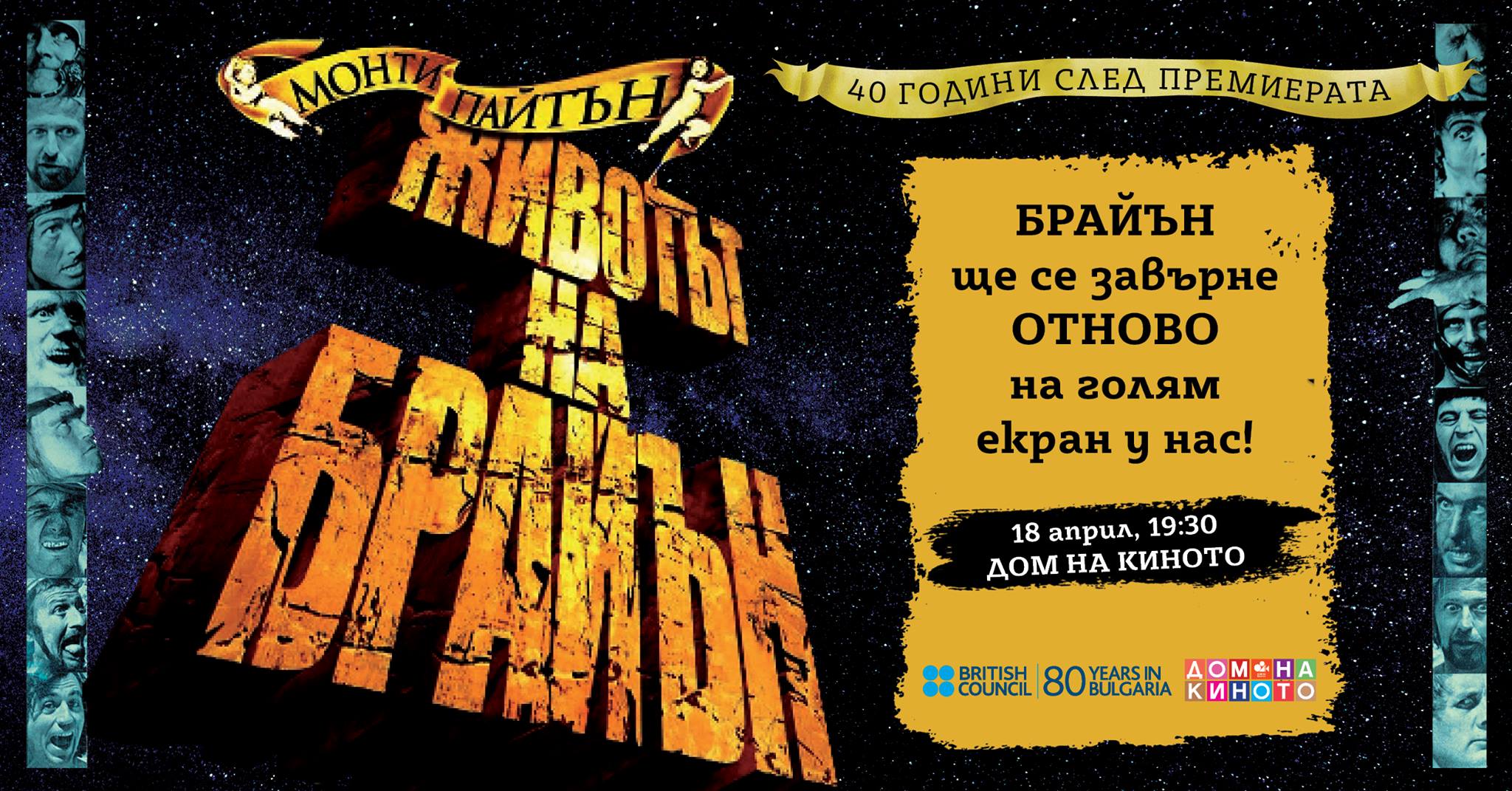България е сред световните дестинации, които ще имат шанса да покажат отново на голям екран една от епохалните творби на Монти Пайтън – „ЖИВОТЪТ НА БРАЙЪН“. В лентата участие взимат легендарните Греъм Чапман, Майкъл Пейлин, Джон Клийз, Ерик Айдъл, Тери Гилиъм и Тери Джоунс, който е и режисьор на сатиричната сага. 40 години след премиерата през 1979 година всички отново запяват в един глас „Always look on the bright side of life!“, а ние имаме възможността да се потопим в уникалното им чувство за хумор, зареждайки седмицата с огромна доза искрен смях.
